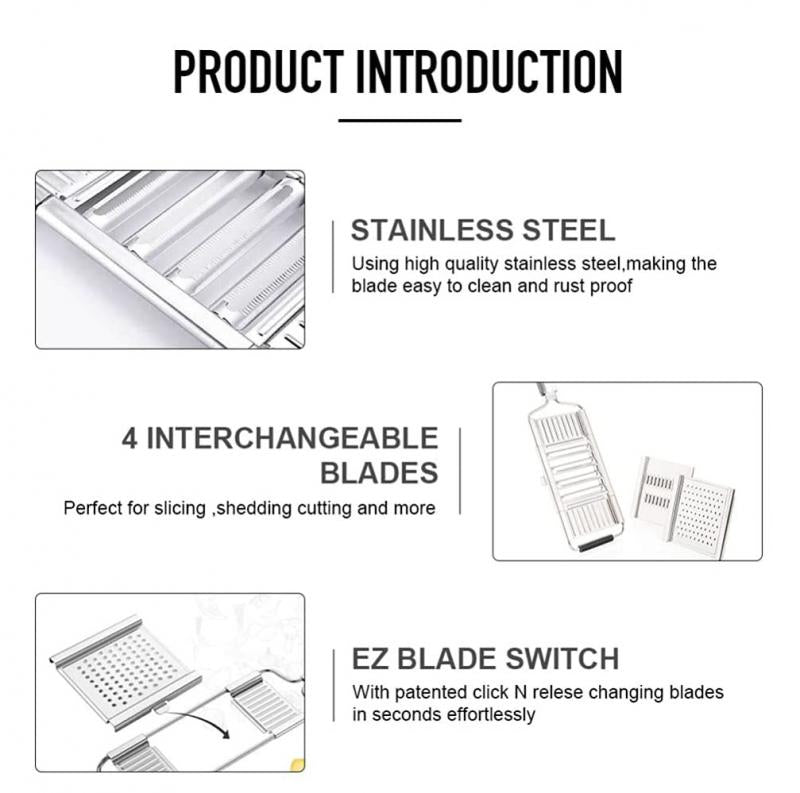 Introducing the new Multi Vegetable Slicer Stainless Steel Shredder Cutter Grater Slicer Adjustable Kitchen Tool! This versatile kitchen gadget is a must-have for every home cook. With its adjustable blade, you can easily slice, shred, and grate your favorite vegetables like onions and cabbage. Made with high-quality stainless steel, this vegetable slicer is built to last and is dishwasher safe for easy cleaning. The package includes 1 Multi-Purpose Vegetable Slicer and 4 replaceable blades, making it a great value for your money. Its compact design makes it easy to store in your kitchen cabinet or drawer. This vegetable slicer is eco-friendly and stocked with features that will make meal prep a breeze. It's also certified by CIQ, so you can be sure that it meets the highest standards of quality and safety. Get your hands on the Multi Vegetable Slicer Stainless Steel Shredder Cutter Grater Slicer Adjustable Kitchen Tool today and take your cooking to the next level!