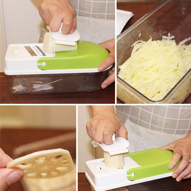 Kitchen assistant: This hand-held slicer is made of food-grade stainless steel +ABS plastic. It provides all the functions of multiple devices with variable stainless steel blades. These blades can be cut through a variety of vegetables, reduce grating cheese, cut potatoes and fruits, and even create paste-like vegetables or mashed potatoes.
