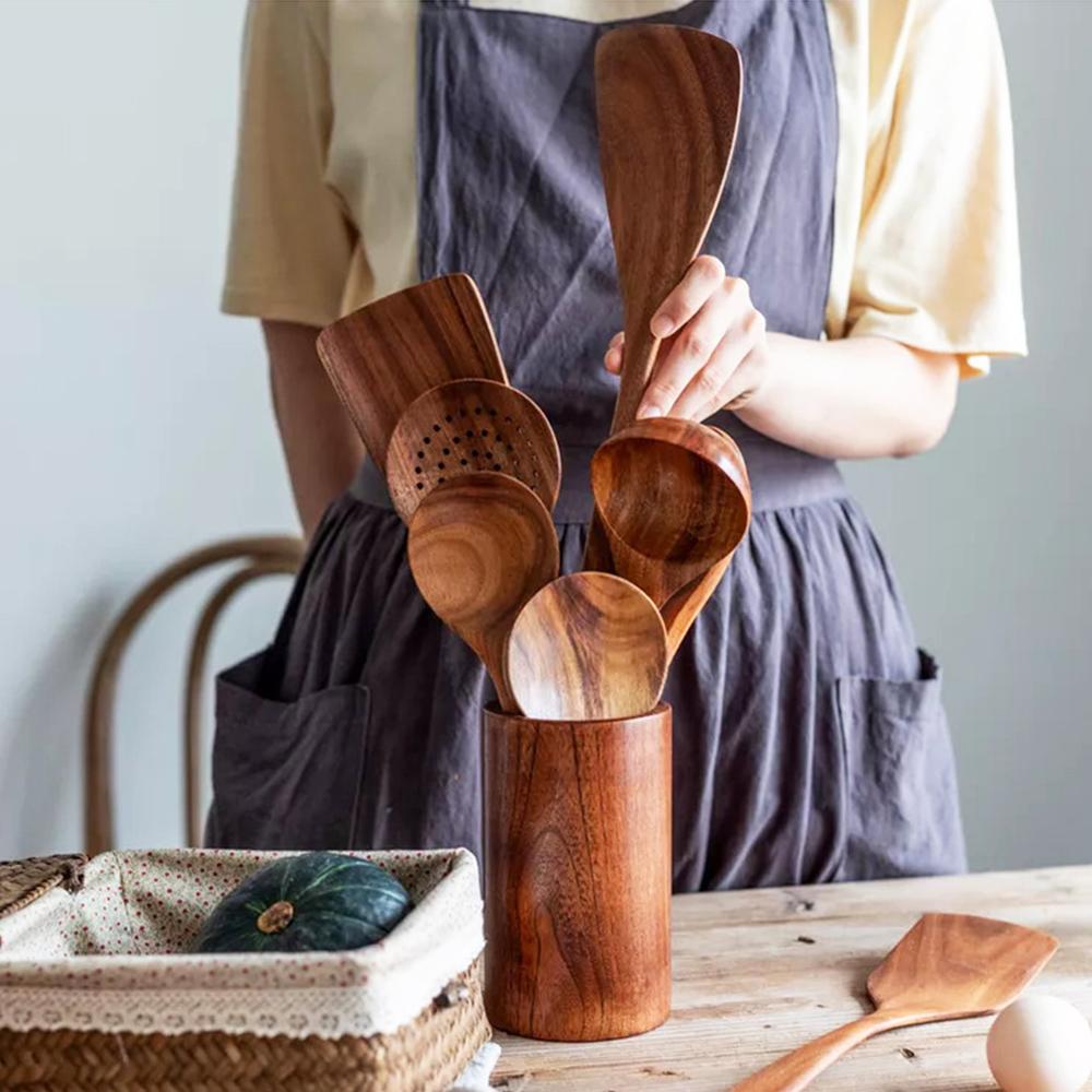 Teak Natural Wood Tableware Spoon Ladle Turner Long Rice Colander Soup Skimmer Cooking Spoons Scoop Kitchen Tool Set