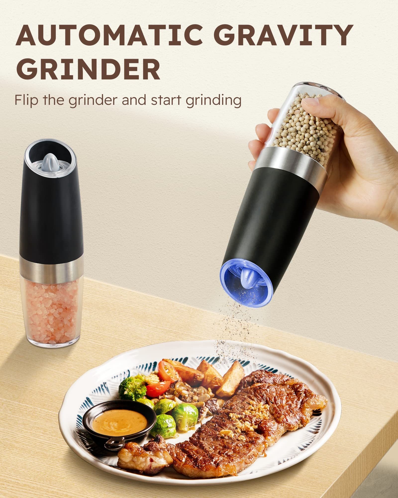 - GRAVITY SENSING AUTOMATIC OPERATION - The gravity salt and pepper grinder set of 2 packs uses advanced gravity sensing technology to provide effortless one-handed operation. Simply flip the grinder over and enjoy freshly ground spices without grinding manually or pushing buttons. Battery powered, each grinder requires 6 AAA batteries (not included). Present this battery operated set to friends or family as a holiday thanksgiving Christmas gifts– their kitchen isn't complete without this electric grinder set