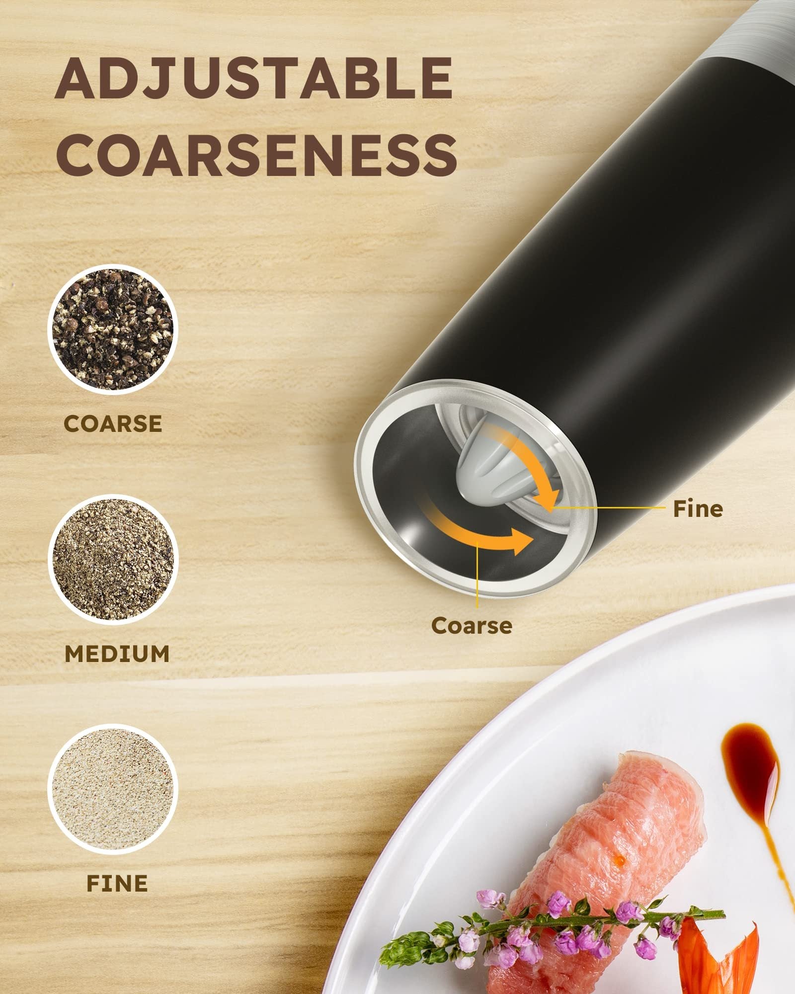 - ADJUSTABLE COARSENESS - The battery operated electric salt and pepper shakers grinder set comes with an adjustable ceramic grinder knob with a built-in high-quality ceramic core to easily adjust the coarseness of spices. The salt grinder salt and pepper shakers set electric is widely used for grinding pepper, salt and other solid granular spices. Convenient to use anytime and anywhere. Great helper for kitchen, restaurant, party, outdoor picnic