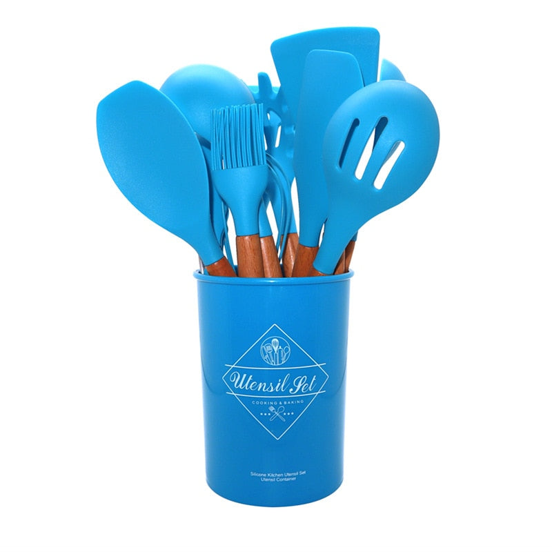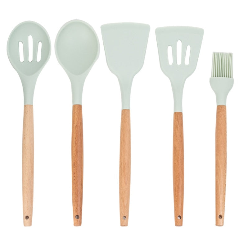 Silicone Kitchenware Cooking Utensils Set Non-stick Cookware Spatula Shovel Egg Beaters Wooden Handle Kitchen Cooking Tool Set